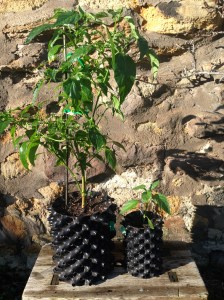 I started some chilli plants at the end of last year and they are now going into 1 litre Air-Pot propagation pots, I am hoping these will be far enough advanced to use as display plants on Air-Pot stands at garden shows later in the year. Air-Pot is going to Chelsea Flower Show (22nd – 26th May) for the first time so some top class plants will be needed to dress the stand. If the young chilli plants are not ready I have managed to over-winter some of last year’s chilli plants. Pictured are a couple of Pimientos de Padrón, a little recently sown one and a survivor from last year which is already flowering, fingers crossed for some early pods.