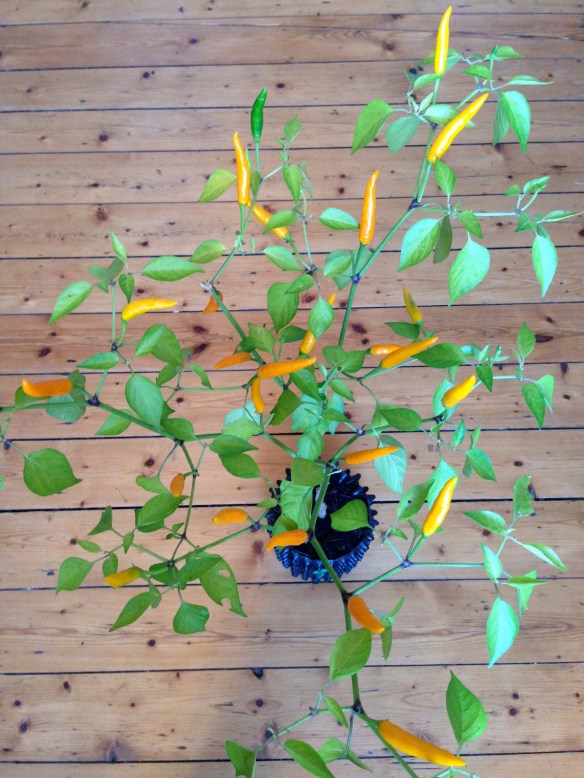 The end of the growing season seems to be extending later than I’ve ever known; after a few cool spells we have had pretty mild conditions. I still have ripe raspberries, I even have ripe outdoor tomatoes here in Scotland in mid November. In previous years I’ve known tomatoes to freeze solid in mid October. Lots of the chillies are still ripening including an accidental cross which has produced lots of attractive hot yellow pods. I saved seeds from a typical red podded piri-piri chilli plant a couple of years ago, but the plant which grew from that seed last year was a bit off type, and seed saved from that plant has now produced pods completely the wrong colour.