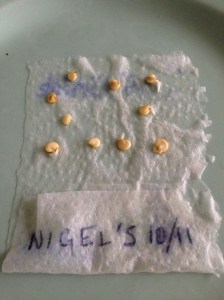 Talking of chilli seed, I did a little viability test of some saved seed, mainly to check the quality of the seed, some of which was rather old, but with an idea that I might get a few plants established extra early. I put a few seeds into folded moist paper towel, in a plastic container in the airing cupboard. After just four days the Nigel’s Outdoors chilli seeds are the first to germinate. As they have proved so keen to get growing, and they are usually about my earliest to ripen, I will get them into soil and hope for super precocious ripe pods.Thinking ahead to next year spurred me to do some Autumn planting of bulbs. After clearing most of the greenhouse plants out I planted up some of the bigger vacated pots with tulips and muscari (grape hyacinth), I look forward to these providing a bit of Spring colour.