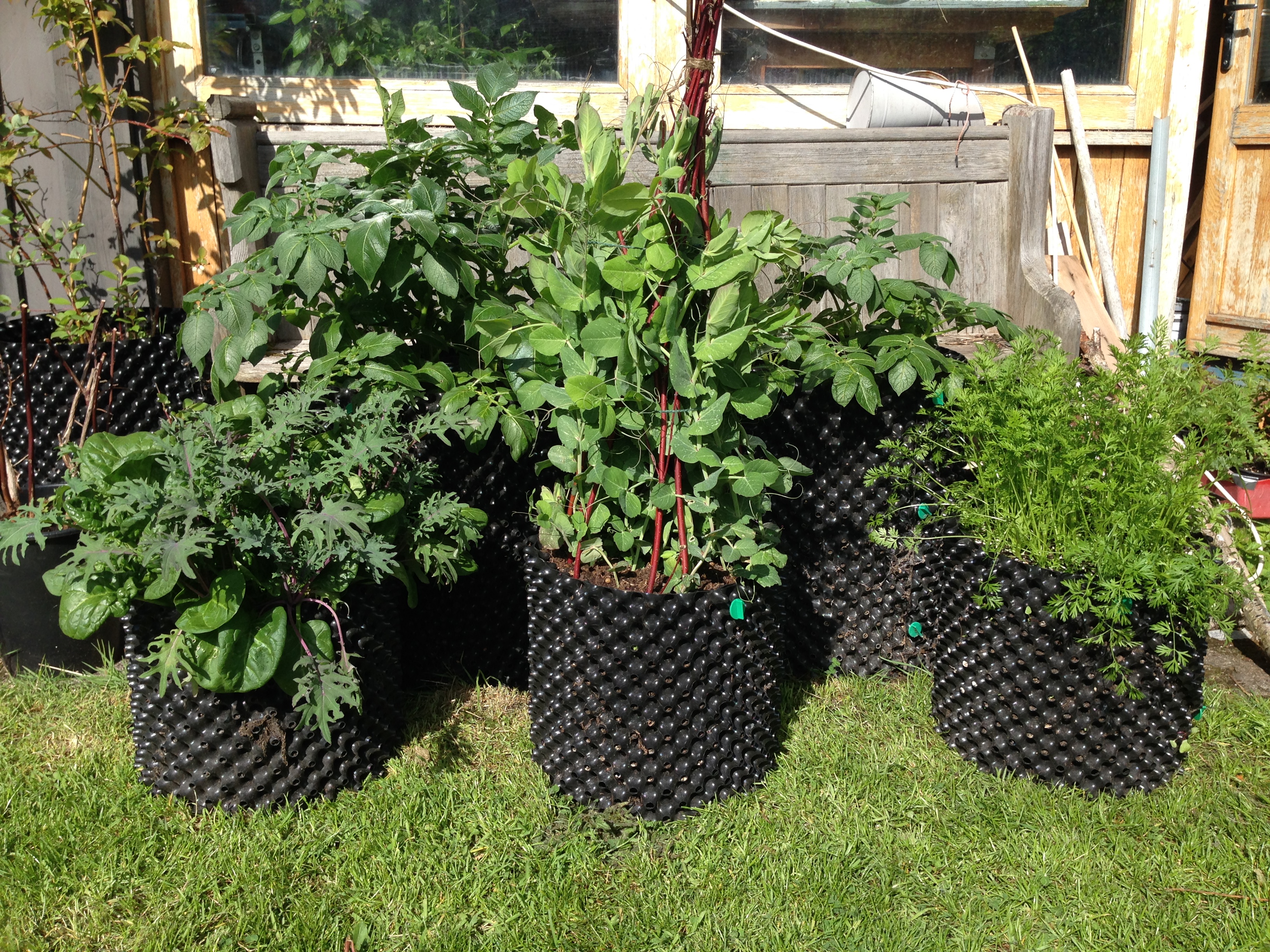 In the three large 20 litre Air-Pot containers are: a mixed planting of spinach and kale, mange tout peas clambering up canes, and early maturing carrots. The spinach and kale combo is ready for picking now and will provide a few super fresh leaves every morning, giving fruit smoothies a vitamin boost. They will crop for many weeks.