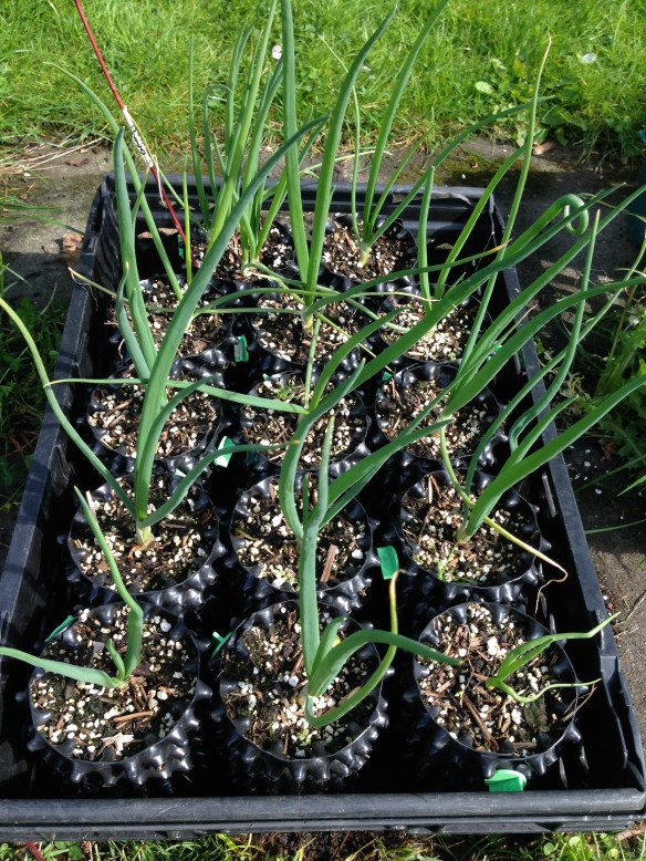 One litre Air-Pot propagation pots have proved useful for starting off a crate exhibition onions and some broccoli plants. I was pleased to find a plastic carrier tray free from the Ikea houseplant department that is perfect for six prop pots. A small wick made from a strip of capillary mat poked through the pot base is a very easy way to keep six pots watered from below.