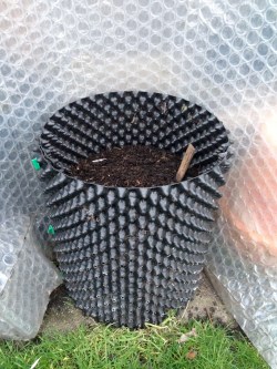 Potatoes can be planted now if you are prepared to protect shoots from frost. Three tubers in a 50 litre Air-Pot Potato Tower can produce several kilograms of extra early potatoes in a greenhouse. This year as an experiment one Potato Tower has been wrapped with sturdy bubble wrap to create an individual mini greenhouse and to ward off hard frosts which might penetrate the soil.