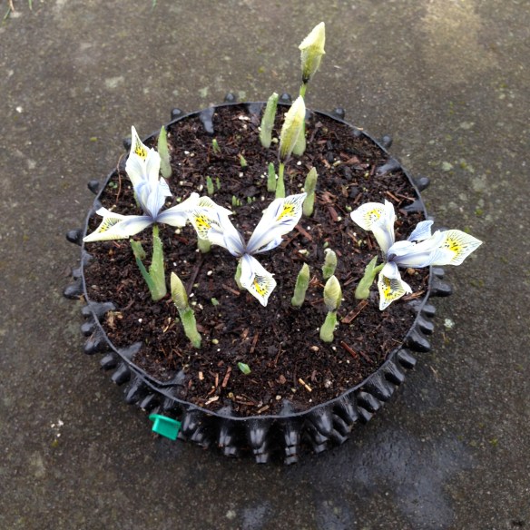I have some iris, tulips and muscari bulbs coming to life which will give some colour, and little Walking Onions which will be good for salads. These onions (a.k.a. Egytptian or Tree Onions) produce small bulblets similar to little onion sets high on the flower stalk. These can be planted in the Autumn to provide a big pot full of Spring green onions. Elephant Garlic is another edible bulb which I have in Air-Pot containers. The 1 litre Prop Pots are perfect to get them off to a good start prior to planting out on the plot as the roots do not get congested, as they do in a conventional pot.