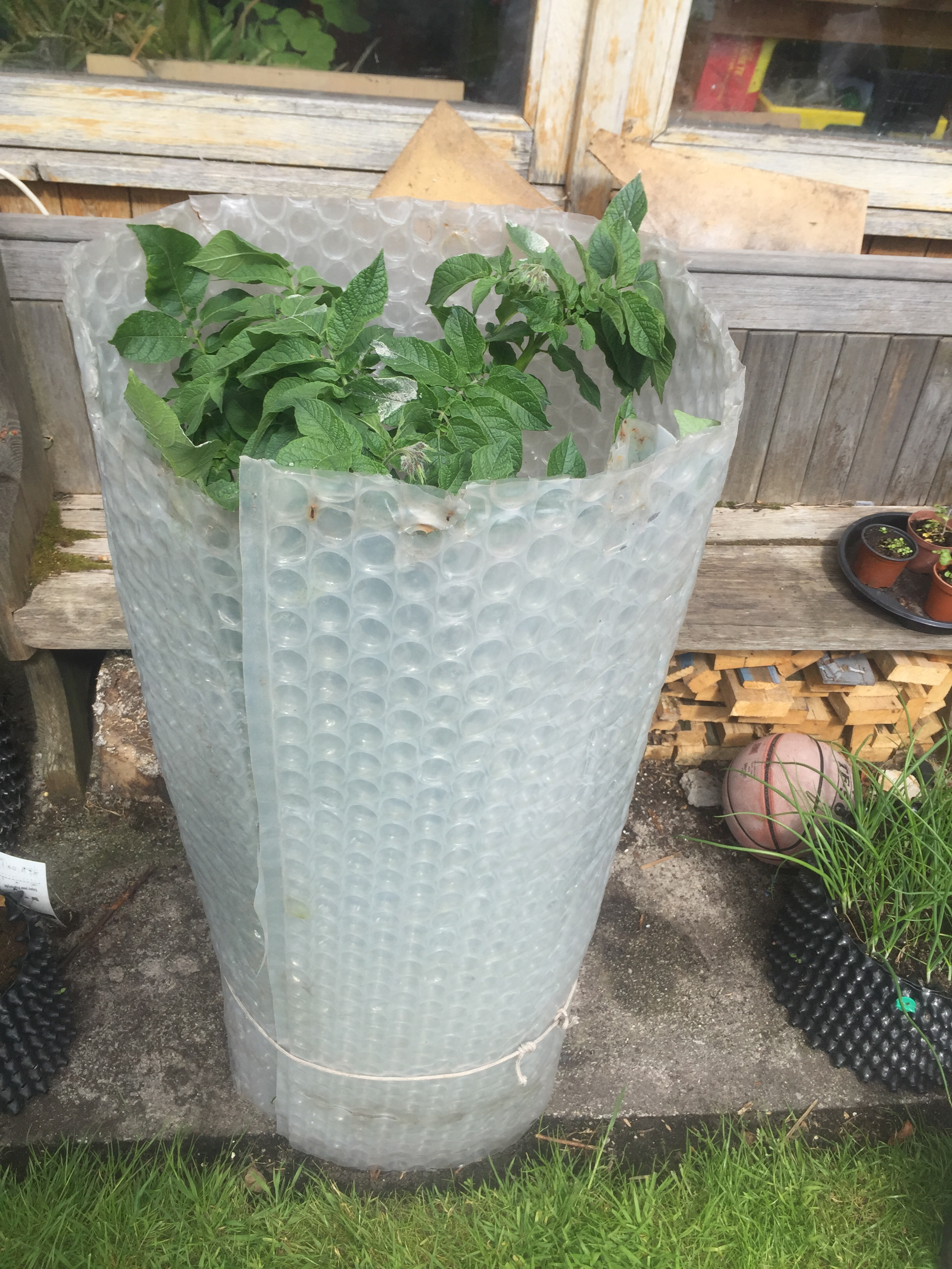 We are expecting a mid-May cold snap here in the U.K. so my potatoes at the plot have had earth mounded up over the young shoots to protect them, but the early planted Air-Pot potato tower already has big plants about to flower, luckily the clear bubble plastic stills fits around the pot and plants. With a bit of fleece on top this should mean the extra-early crop stays snug.
