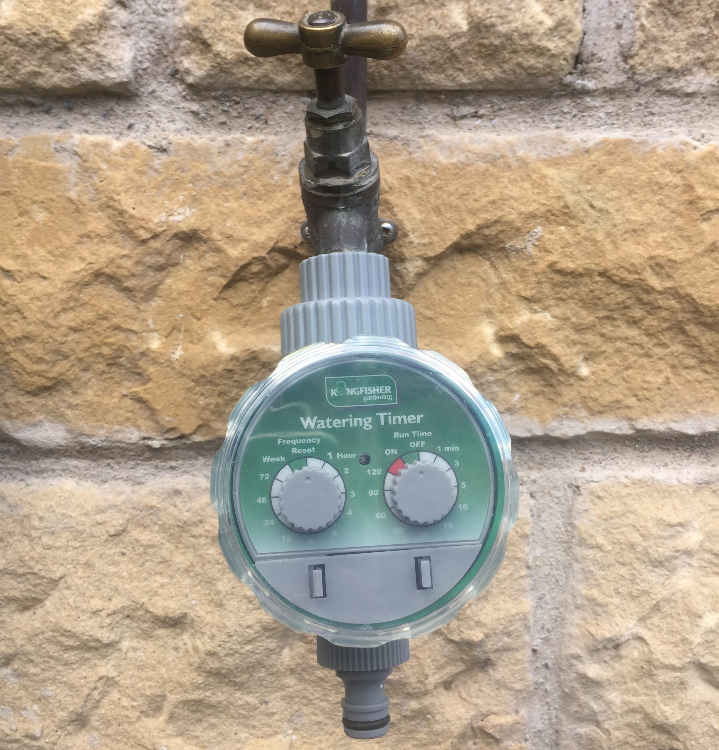 This is convenient if you do not have a mains water supply or just do not want to trail high pressure pipes around your garden. A large tank on a 60cm high platform beside my greenhouse feeds 20 or 30 pots for 10 – 14 days which is truly liberating. If you are setting up this type of low pressure system it is important to get the correct type of timer, many use a diaphragm valve which can only open if water pushes through at mains pressure. But the cheaper simple designs have a ball valve which opens and closes as the ball turns through 90 degrees, the type with a clear circular screw cover costs about £15 and is sold under several brand names including Kingfisher. The timer screws directly onto the thread of a garden tap and it is worth fixing this type of tap to a stake right in your greenhouse. It is then a fairly simple plumbing job to run some flexible plastic 15mm (1/2 inch) pipe between your tank and the tap. Most dripper systems will then connect to the standard garden hose click connection at the outflow end of the timer.