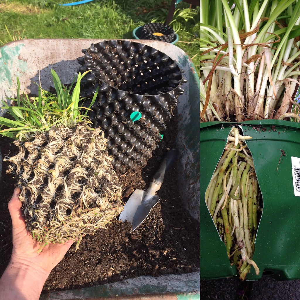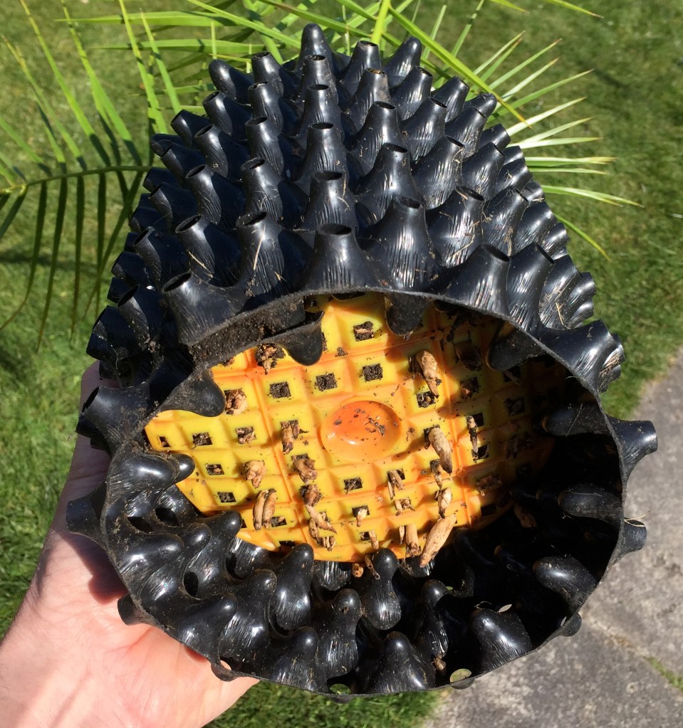 Some palm trees which were recently potted-on into bigger containers proved to have well air-pruned roots. Thick succulent roots of a date palm poked out through holes in the raised base of an Air-Pot but were unable to extend further due to the drying air circulating under the pot. Another well controlled root structure was in evidence when recently repotting an agapanthus. This is in contrast to the ordinary pot it came in which had been split open by these rather thuggish roots.