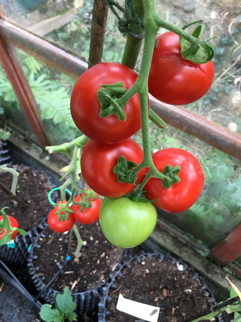 The tomatoes are hitting the roof and touching at the ridge to form an arch. Top varieties this year are Ferline and Crimson Plum which have been productive indoors and out. They have the advantage of being blight resistant, so even stand a chance of cropping outdoors during warm wet spells when blight destroys most outdoor tomatoes.