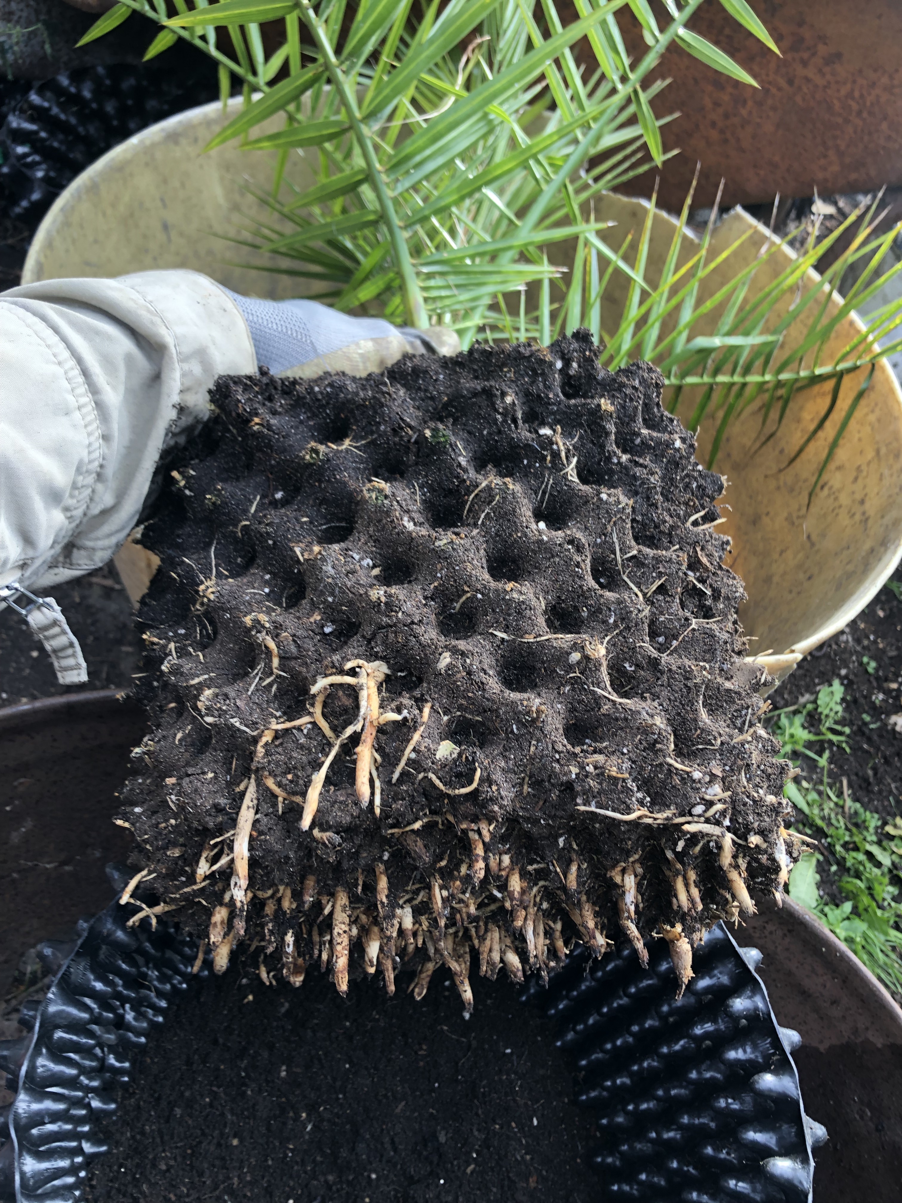 Some longer established trees are also of interest are: a Pink Lady apple tree grown from a pip, which has produced beautiful fruit; and a date palm which was recently re-potted, showing a good view of the air-pruning roots. These vigorous downward pointing water seeking roots would have become severely pot bound in a conventional pot, as they circled seeking a way out.