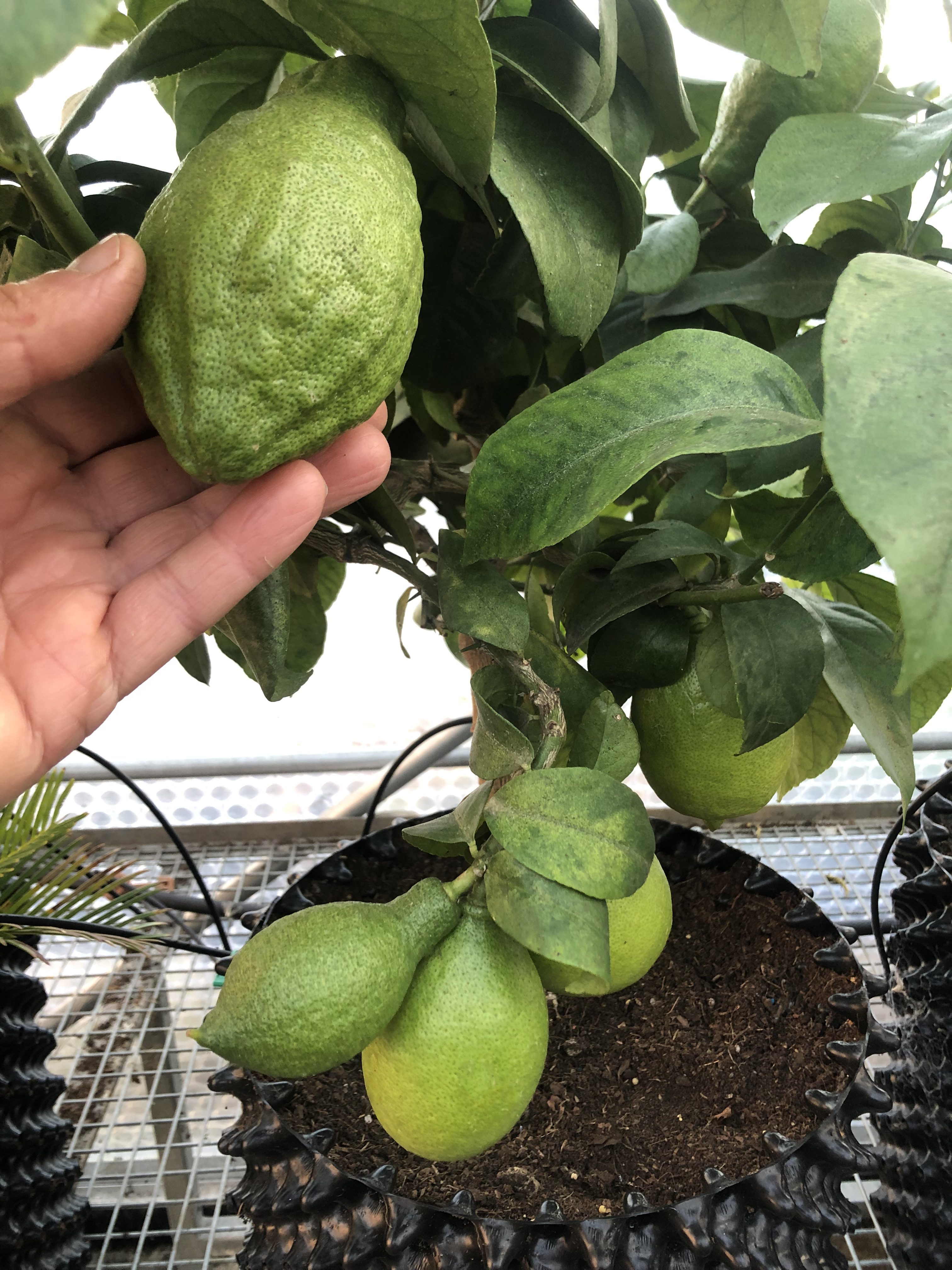 Requiring more warmth are two varieties of lemon, which are in a frost-free outhouse. These can be outdoors for most of the year, but as their slowly maturing fruit looks tantalisingly close to ripeness they are being kept in an insulated shed. An 80 W tubular greenhouse heater keeps the temperature above 6 degrees C.These citrus have put on good growth this season in 20 litre Air-Pot containers in a slightly acid soil mix, with generous feeding.