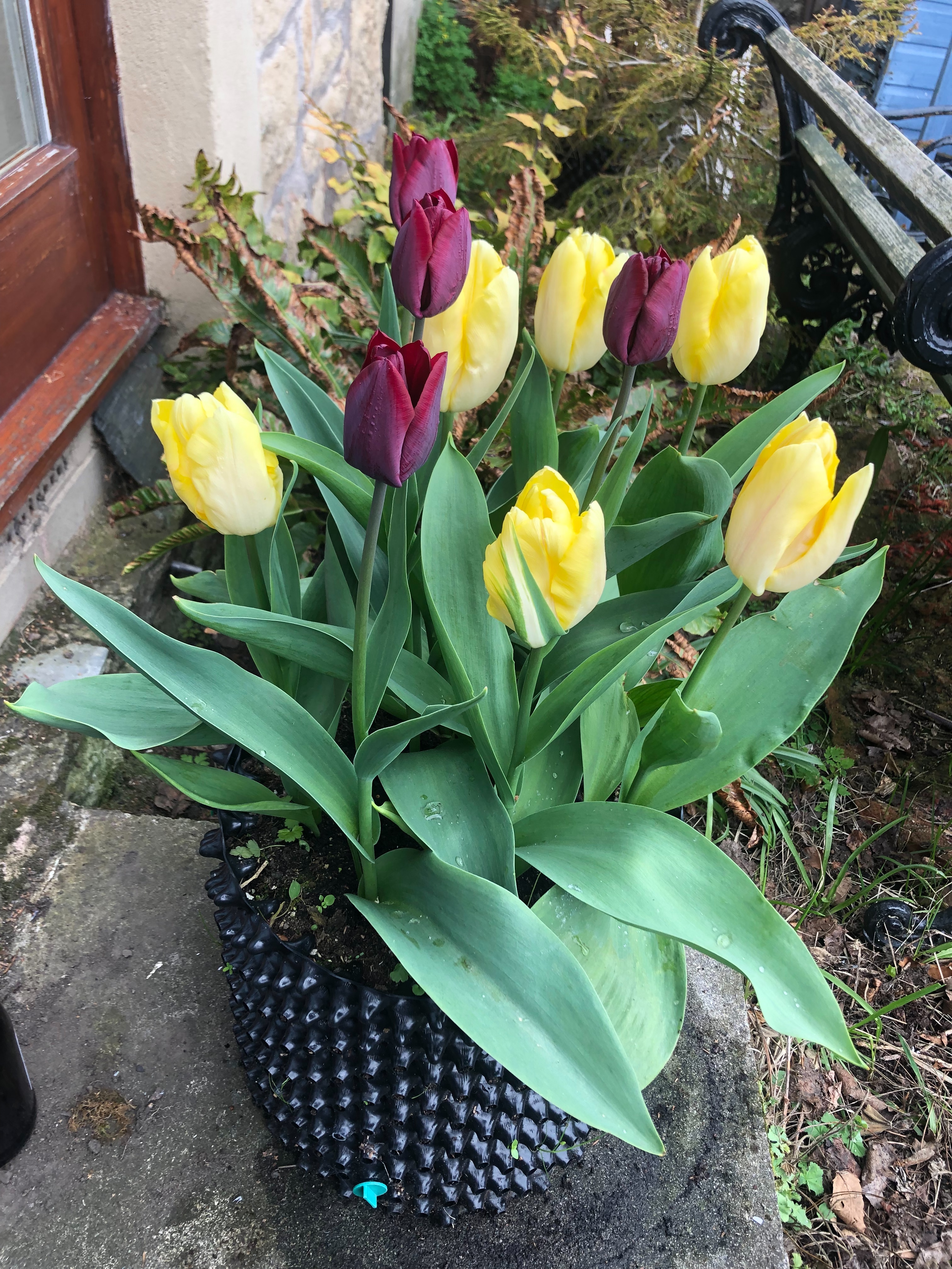 I came across a bag of neglected tulip bulbs and am delighted that they have produced a striking display of yellow and red blooms.