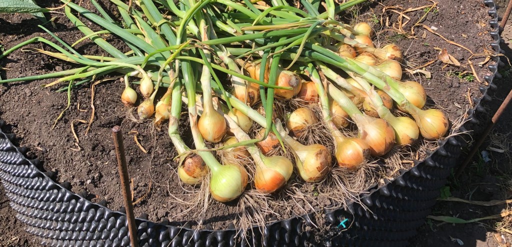 Around mid-summer the overwintered onions are ready. This type – sometimes known as Japanese Onions – are hardy enough to sow in Autumn and mature much earlier than traditional ones. This leaves time for another crop to jump straight into the raised Air-Pot bed. The Japanese / overwintering onion was previously considered not to store for long – but this new variety Hi-Keeper claims to be a good storage onion.