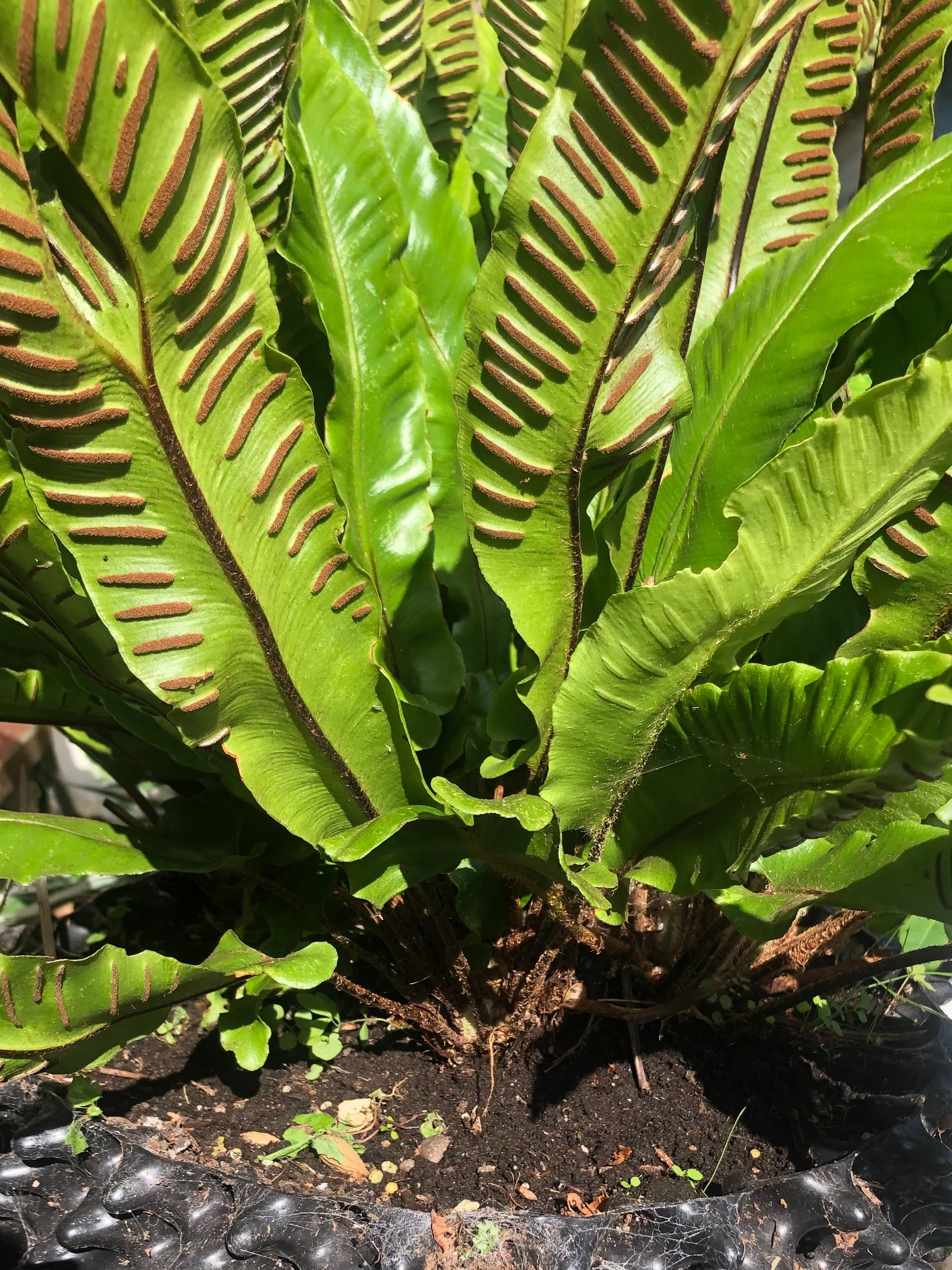 Hart’s-tongue fern (Asplenium) seems to like my garden appearing in cracks in concrete and neglected shady wild corners. Perhaps the mother plant is this one growing in an Air-Pot container. This fern can grow on rocky slopes, walls and even tree branches but it seems to appreciate an Air-Pot container where it produces large fronds thick with the fuzzy chocolate coloured spores, more like Moose’s tongues than Hart’s-tongues.