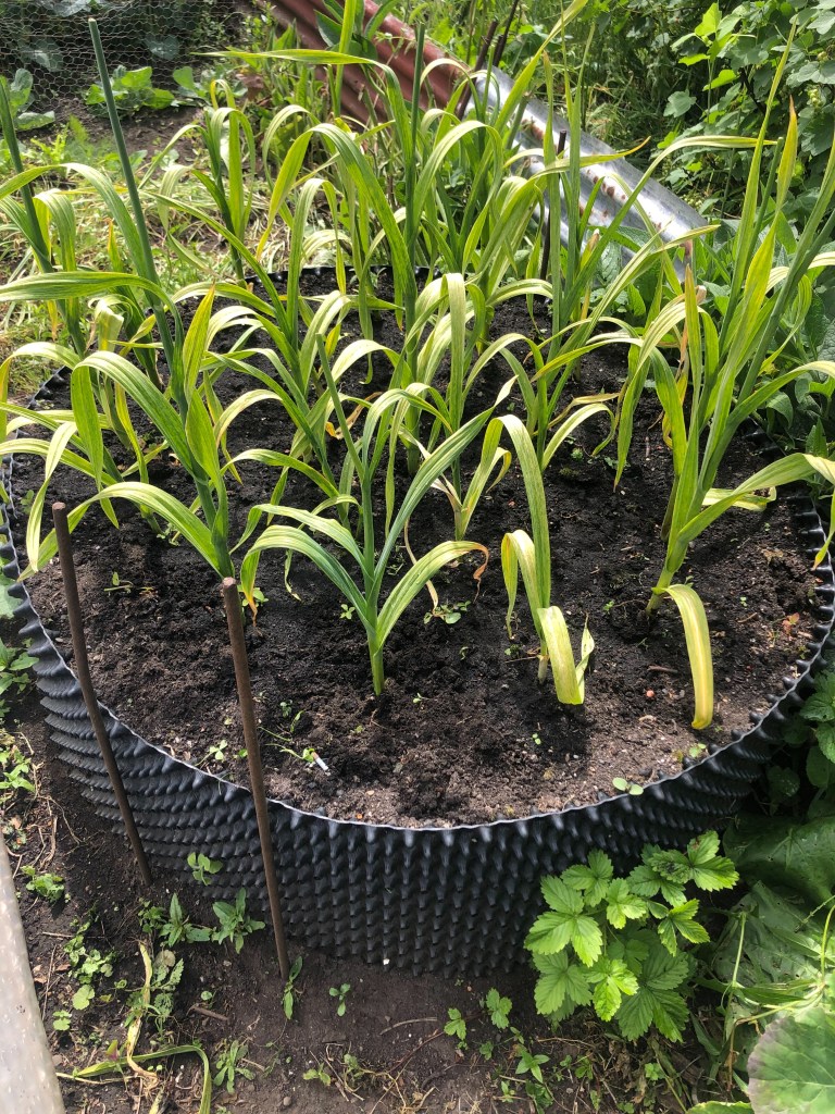 Elephant Garlic in the big Air-Pot raised bed should be bulbing up now. They were planted around the shortest day & will be lifted around the longest day. It is a useful over winter crop and can be cleared early, leaving time for a second crop of carrots or squash.