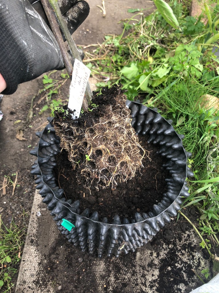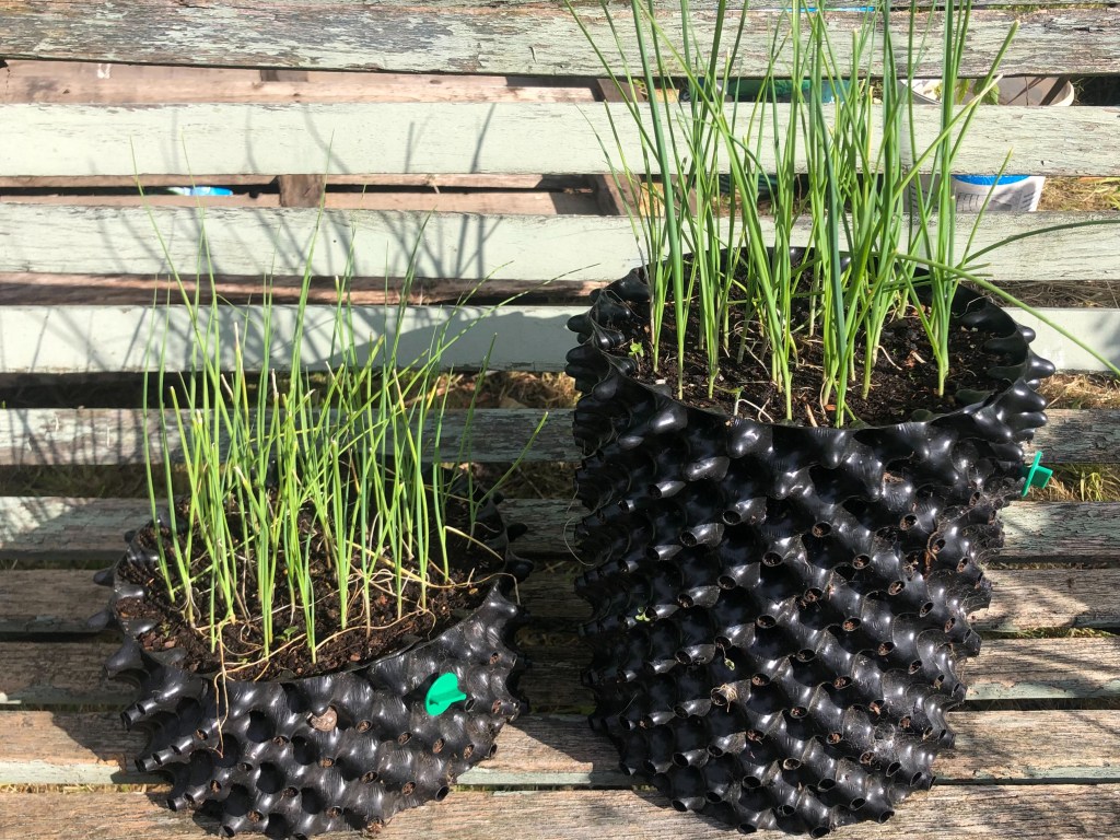 Some leek seedlings which have been raised in pots are going to be planted out at the plot when they are a bit bigger. Leek transplants are often given a trim of their roots before dibbing into holes. I am growing some in shallow Air-Pot trays & some in deeper pots to see if air-pruning of roots shorter or longer is best when planting out. Possibly shorter air-pruned roots will not need trimming?