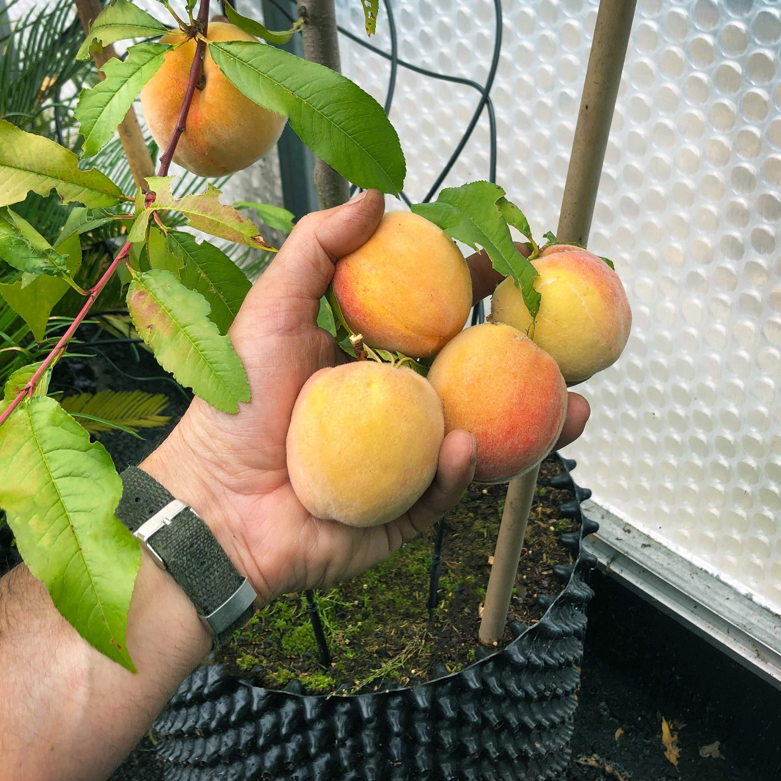 Our Peach tree in an Air-Pot container has produced a good crop. Keeping it in the poly tunnel for the first half of the year protects it from peach leaf curl fungus and allows the fruit to ripen. The tree has now been moved outdoors for the rest of the year as the indoor space is needed for other crops.